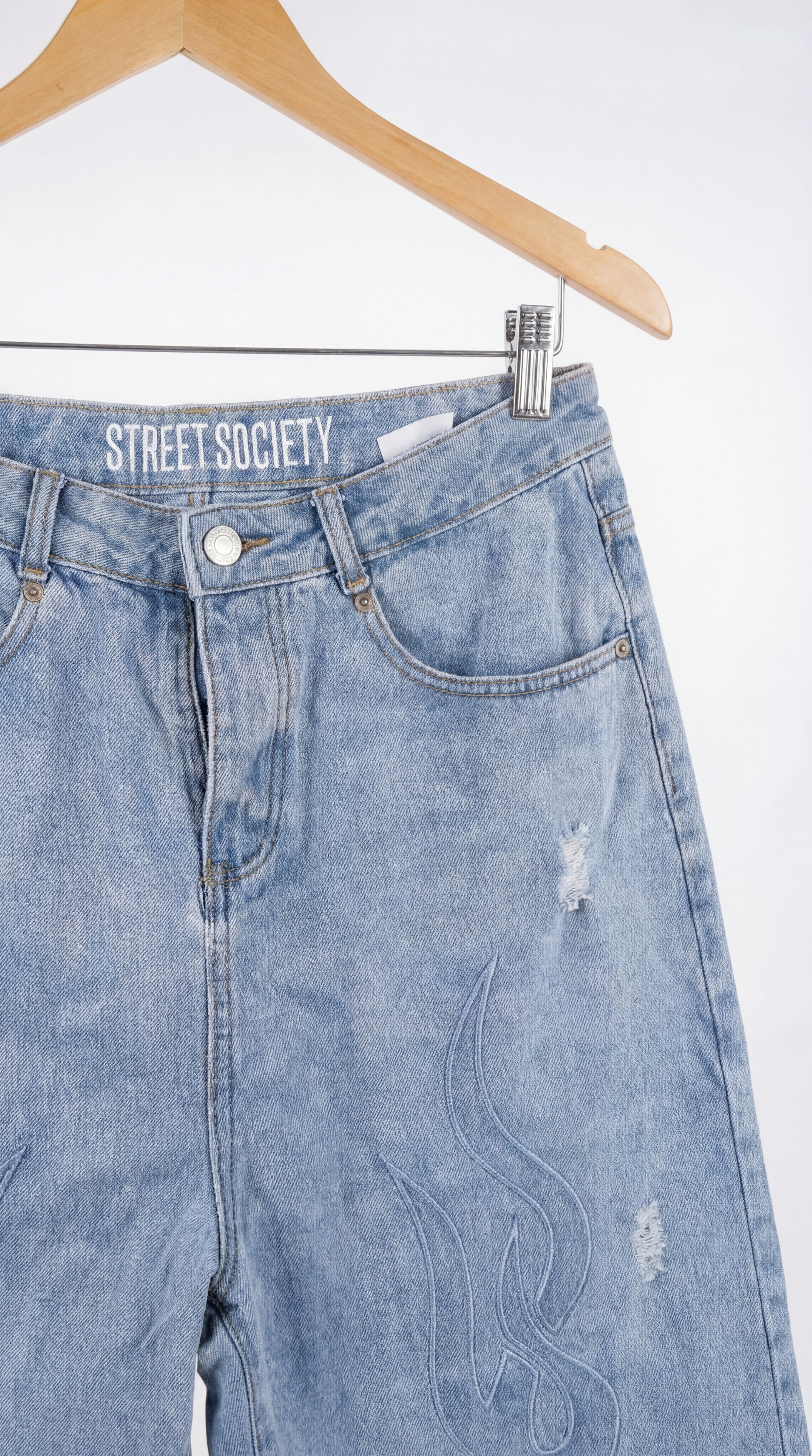 Men’s loose-fit long denim shorts made from heavyweight, premium-quality denim. Designed with a relaxed silhouette for comfort and durability, featuring a unique design by Street Society. The light blue wash adds a clean, versatile look suitable for streetwear and casual outfits. Easy to style with hoodies, T-shirts, and sneakers for everyday wear.